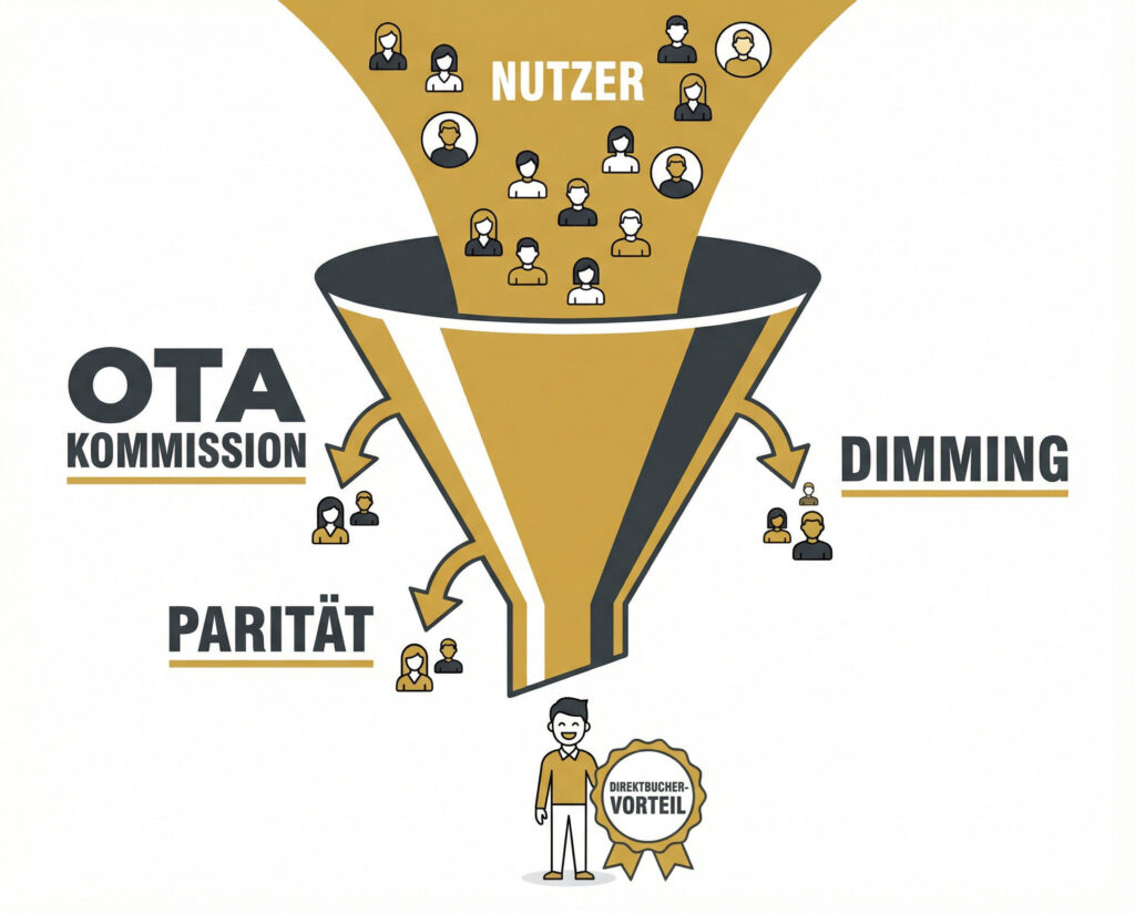 Die Falle: OTAs nutzen „Dimming“ – algorithmische Bestrafung durch Sichtbarkeitsverlust –, wenn Hotels auf der eigenen Website günstiger sind.
